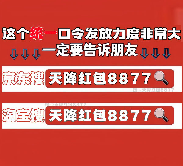 劃重點(diǎn)!今年天貓/淘寶和京東最新的雙十一統(tǒng)一紅包口令都是「天降紅包8877」一定要記?。☆I(lǐng)的紅包大小和你搜索的什么口令有關(guān)的!“天降紅包8877”這個(gè)雙平臺(tái)唯一紅包口令包領(lǐng)到大的!記得每天去領(lǐng)!