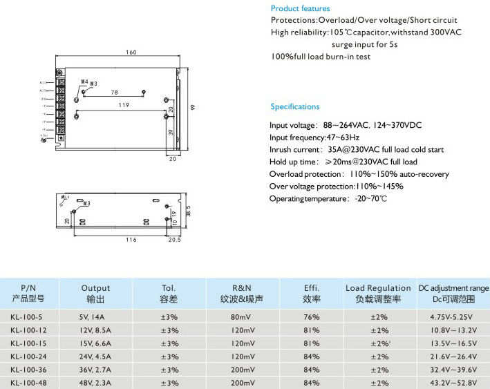 高可靠性:105C長(zhǎng)壽命電容,能承受300VAC輸入電壓5秒不損壞 100滿載老化測(cè)試 輸入電壓:88-132VAC,176-264VDC,249-370VDC 輸入頻率:47~63Hz 沖擊電流:35A@230VAC滿載冷態(tài) 保持時(shí)間:≥20ms@230VAC滿載 過載保護(hù):110%-150%自動(dòng)恢復(fù) 過壓保護(hù):110%~145% 運(yùn)行溫度:-20-70℃" />